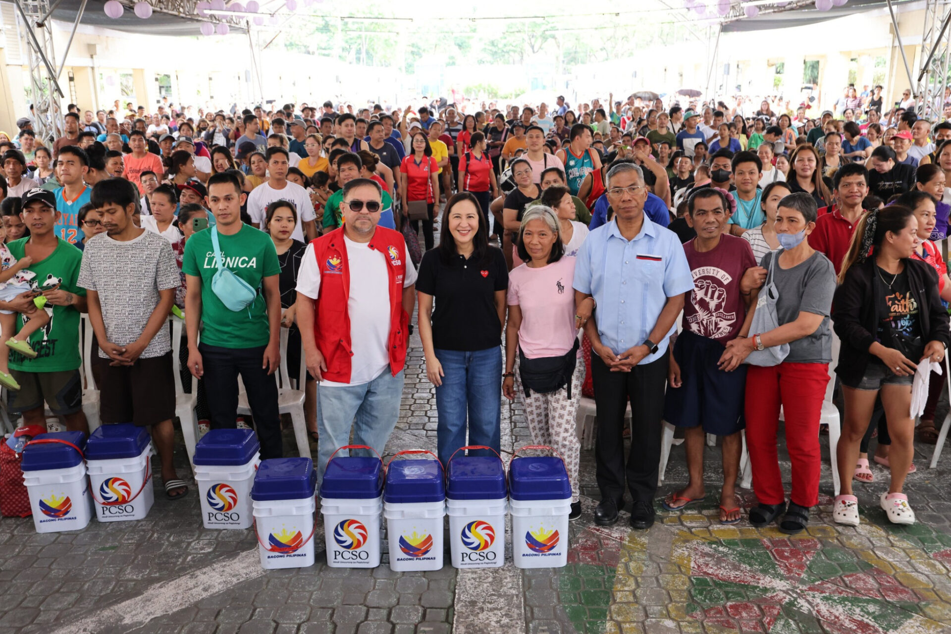 Around 2,000 families displaced by a fire in Barangay Pinyahan, Quezon City, received relief assistance from the PCSO, MMDA, and the Quezon City LGU. The aid included “Charitimba” buckets with food and essentials, as well as modular evacuation tents distributed at the